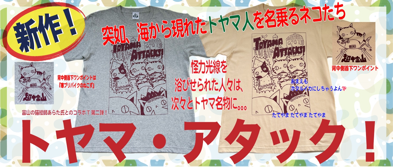 4月の新作、トヤマ・アタック! 持って行きますよ^^ 富山の猫絵師あらた氏とのコラボT第二弾です!