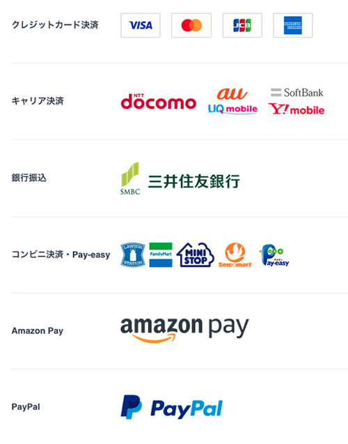 銀行振込、コンビニ決済・Pay-easy、Amazon Pay、PayPal決済がご利用いただけます。
